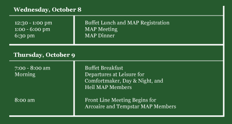 Arrive at the hotel on Wednesday, October 8 in time to register for the MAP Meeting and have lunch at 12:30 pm. Depart the hotel after 12:30 pm on Friday, October 10